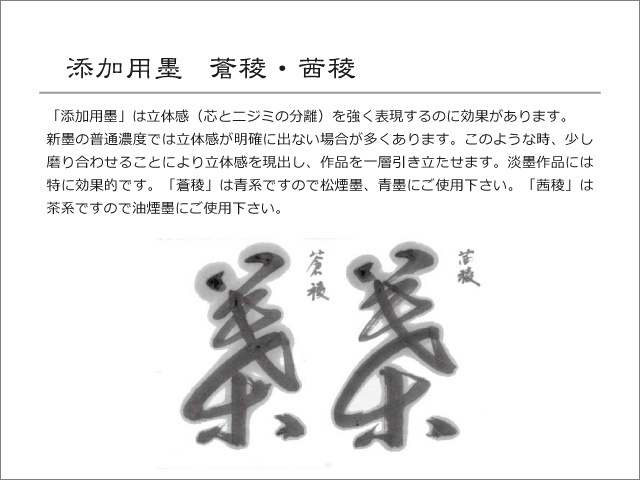 ・添加する量が多くなると立体感の出方もより強くなります。磨り込みすぎて極端な立体感が出る場合は、お使いの墨の濃度を濃くした後、元の濃さまで水で薄めて墨色を確認してください。