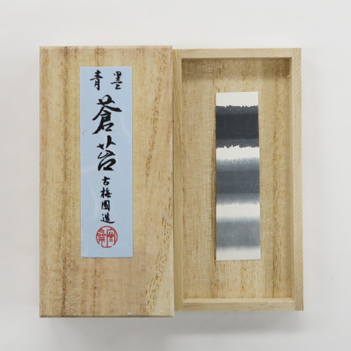 TOP色材 墨 固形墨 [古梅園] 蒼苔 (青墨/1.5丁型) 価格: ¥4,950 (税込) [ポイント還元 49ポイント~] 販売期間: 数量: 丁 在庫 在庫あり 返品についての詳細はこちら 水墨・俳画用の青墨 天正5年(1577年)から続く古梅園の長年にわたる経験で開発されて青墨です。 暢びの良い上質の油煙と上質の膠に本藍を加えてあります。 青味が強く、濃く使用しても鮮やかな蒼灰色が表現されます。